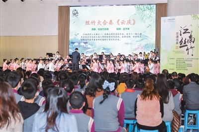 台上,校丝竹乐团的近百位学生身着演出盛装,带着心爱的乐器轮番上场。他们或合奏江南丝竹名曲《金蛇狂舞》《云庆》,或以年级乐队的形式分别演绎丝竹小合奏。该校教师丝竹乐队则将江南丝竹市级传承人俞华康为陆行南校定制的《丝语竹韵》演绎得淋漓尽致。