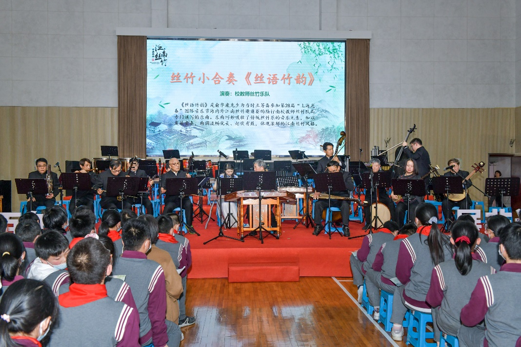 台上,校丝竹乐团的近百位学生团员身着演出盛装,带着心爱的乐器轮番上场。他们或合奏江南丝竹名曲《金蛇狂舞》《云庆》;或以年级乐队的形式分别演绎丝竹小合奏;该校教师丝竹乐队则将江南丝竹市级传承人俞华康先生为陆行南校定制的《丝语竹韵》演绎得淋漓尽致。