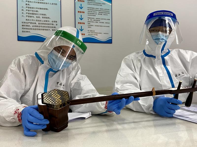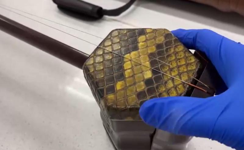 3月8日,上海浦东机场海关关员在一票出口快件货物中查获二胡一把。这把二胡的鼓皮有蛇皮花纹,且皮块表面紧密排列有近似菱形鳞片,疑似蟒蛇皮制品。经上海野生动植物鉴定中心鉴定,该二胡琴鼓的蒙皮由缅甸蟒皮革制。目前,查获的蟒蛇皮制品已依法予以暂扣,案件正进一步办理中。